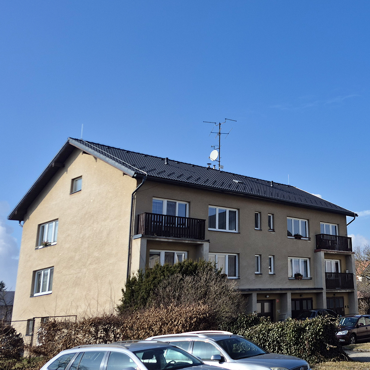 V Chotovinách (BD č. 205, 168 a 169) jsme realizovali výměnu střešní krytiny pro SVJ. Nově je na střechách betonová krytina KM Beta (Briliant) černá.