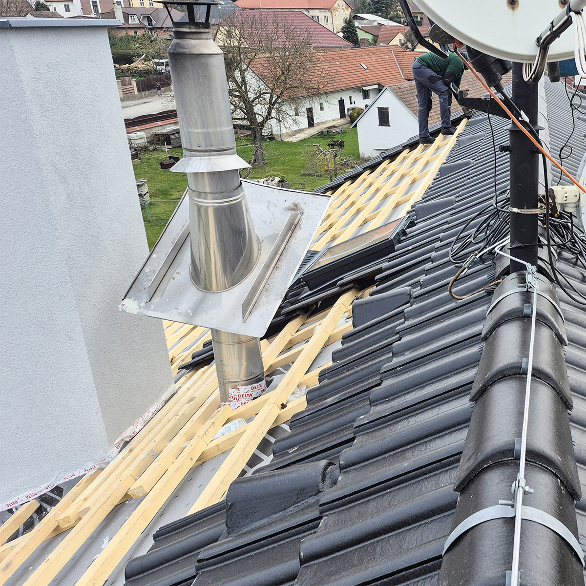 - následně standardní postup: difuzní fólie, kontralatě, laťování, rozměření, klempířské prvky