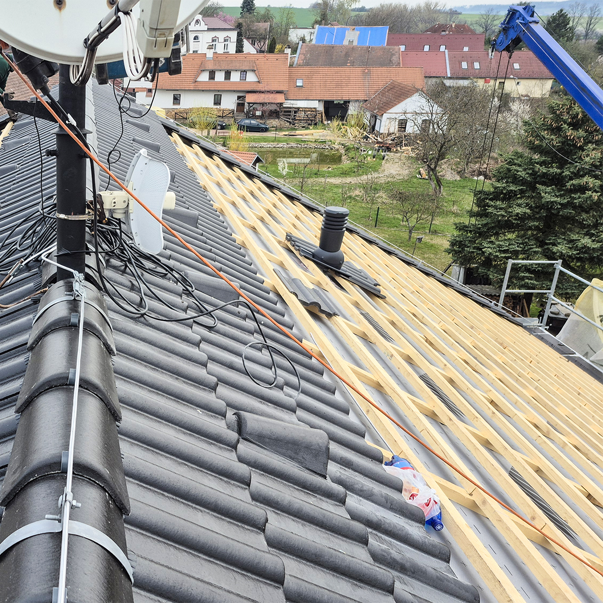 - montáž nové krytiny + nová nadstřešní část hromosvodu