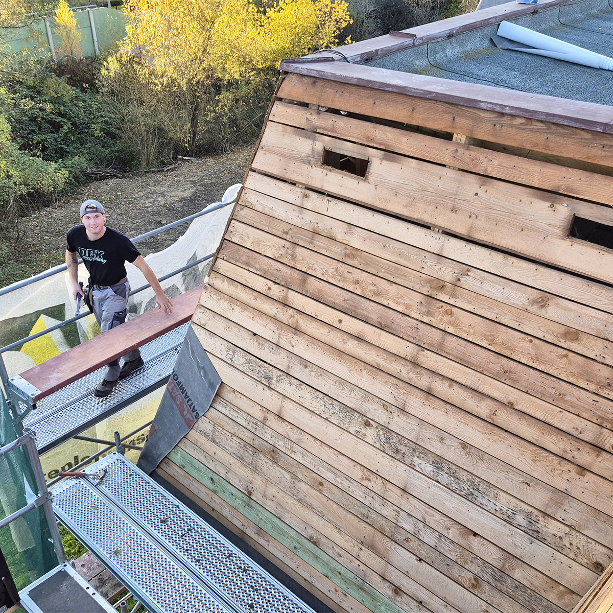 Původní šindel byl výrazně degradovaný a chyběl podkladní pás. Postup byl proto jasný: